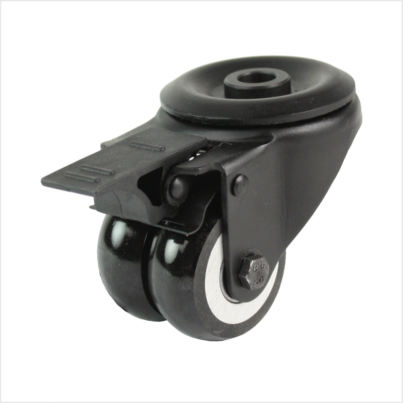 50 mm mini-Schwerlastrolle - schwarze Doppel-Lenkrolle mit Rückenloch und Feststeller flach & ballig